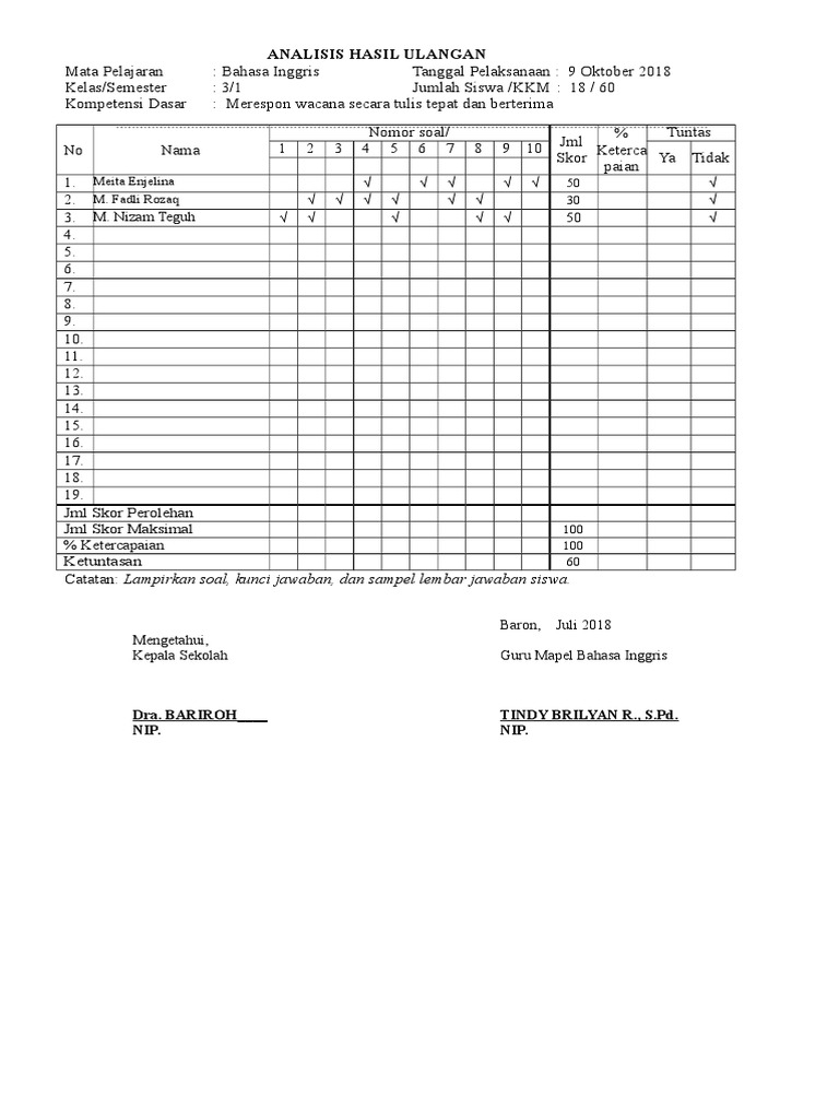 Contoh Format Analisis Ulangan Harian Kurikulum 2013 Tahun 2018